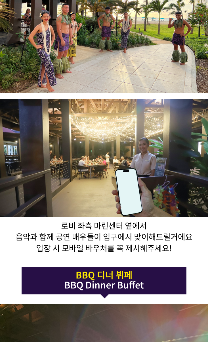 휴양지 오면 전통 공연 꼭 보는 편인데 여기 너무 쾌적하네요. 음식 있는 곳은 실내라서 깔끔하고요. 공연도 되게 괜찮아요. 늘어지는 거 없이 진행도 챡챡 잘 해주셔서 재미있게 보고 갑니다. 가족들이랑 오시면 하루 저녁은 공연 + 뷔페 추천해요~