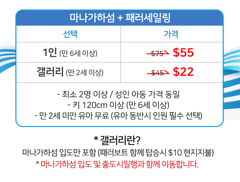 - 갤러리 패러보트 함께 탑승시 $10 (현장결제)