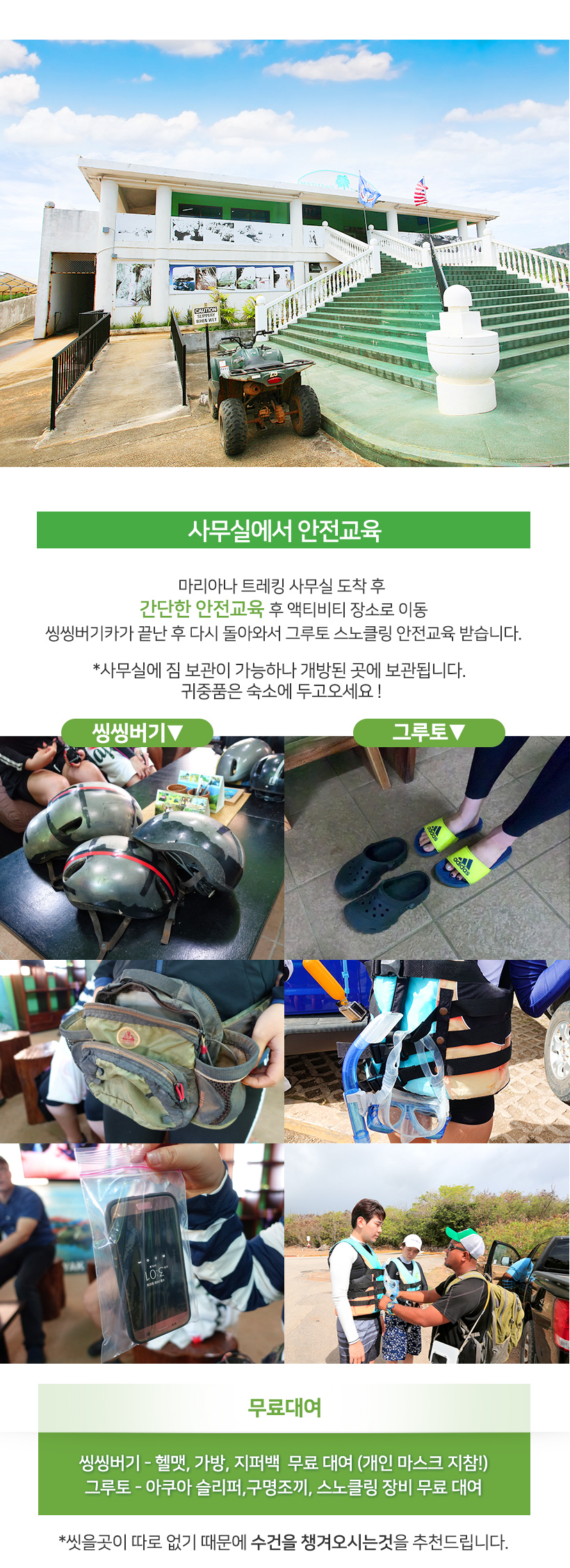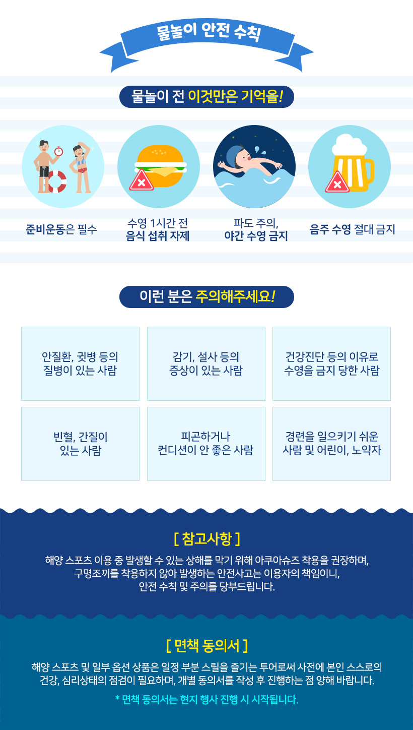 - 해당 옵션을 진행하는 안전 장비 (구명조끼)를 반드시 착용하며 안전요원의 보호 없이 바다 뛰어드는 행위 금지 합니다.