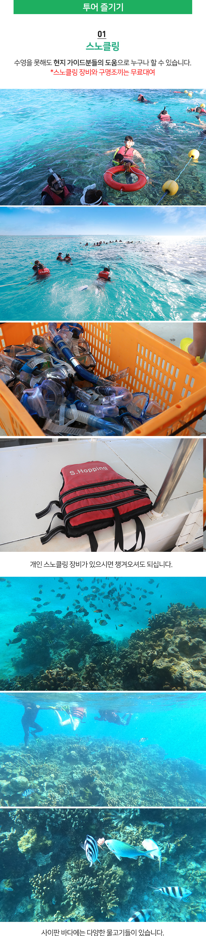 - 스노클링 및 낚시할 경우 물고기에 물리거나 날카로운 산호에 다치지 않도록 개인안전에 주의바랍니다.