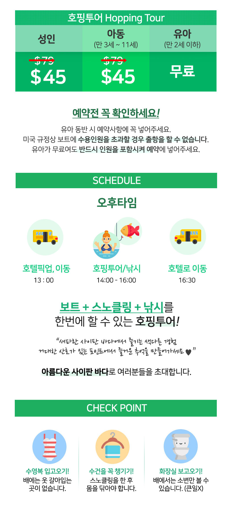 날씨도 너무 좋으셨는데 낚시에 스노쿨링까지 즐거우셨다니 ㅎㅎ 가족단위로도 같이 여행하기 좋은 상품인 것 같아요 ㅎㅎ