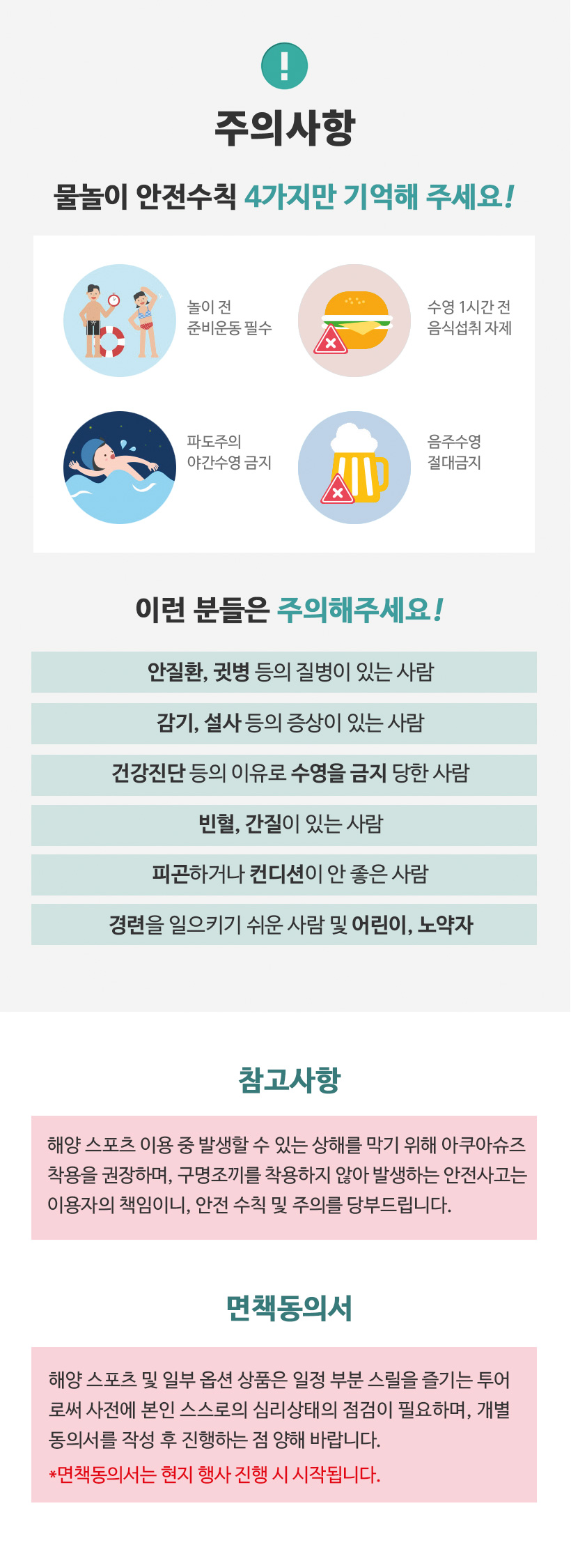 - 해당 옵션을 진행하는 안전 장비 (구명조끼)를 반드시 착용하며 안전요원의 보호 없이 바다 뛰어드는 행위 금지 합니다.
