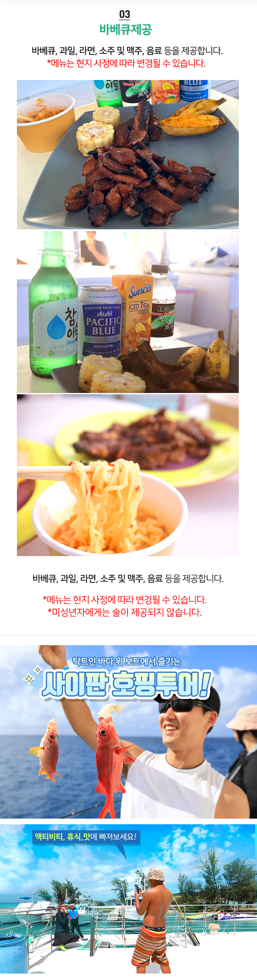 낚시와 호핑투어와 보트체험 모두를 해볼 수 있는 경험이라 특별했구요, 마지막을 장식한 삼겹살과 회도 너무 맛있었어요! 사이판에서 새로운 추억을 만들 분들이라면 강추해요!