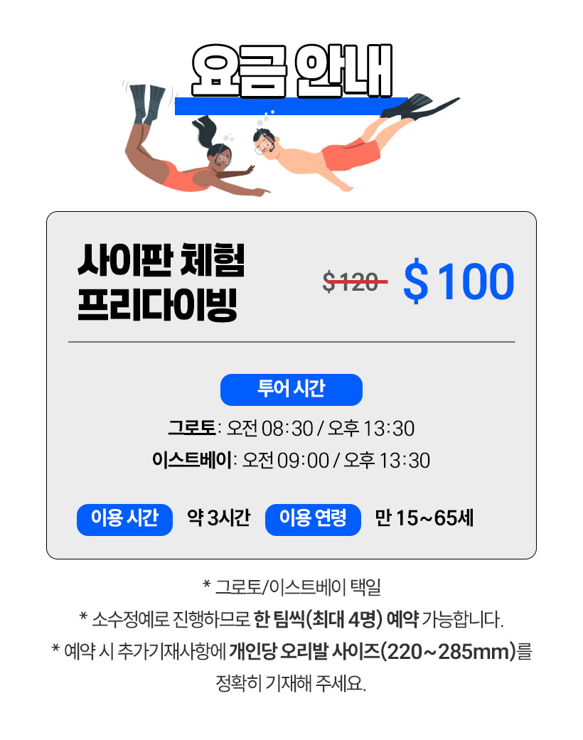 - 예약 시 추가기재사항에 개인당 오리발 사이즈를 정확히 기재해 주세요.(220~285mm)