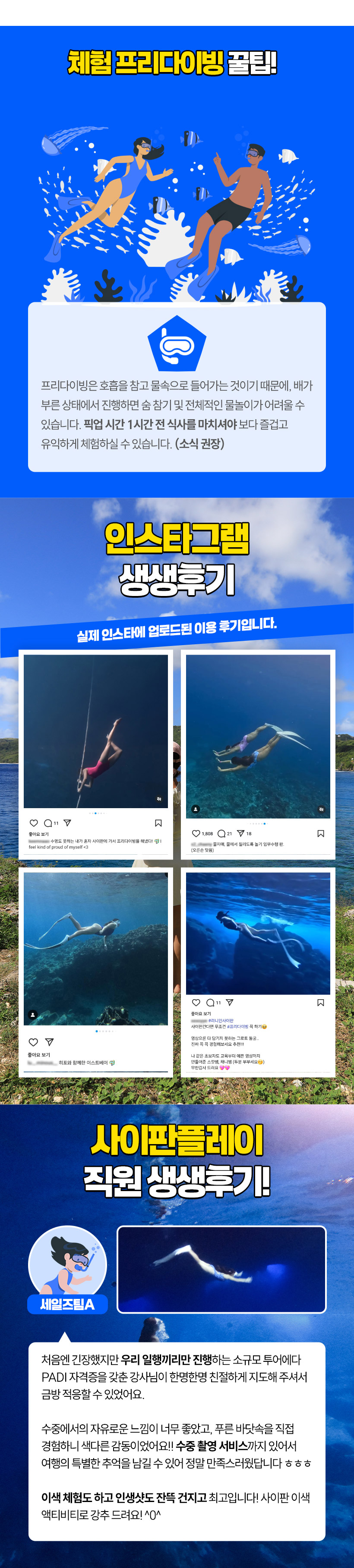 - 고객 부주의 등으로 발생한 부상 및 모든 사고에 대해서는 본인이 책임져야 하며, 예약대행사인 사이판플레이와 현지업체(이하 면책자들)에게 책임을 전가할 수 없습니다.