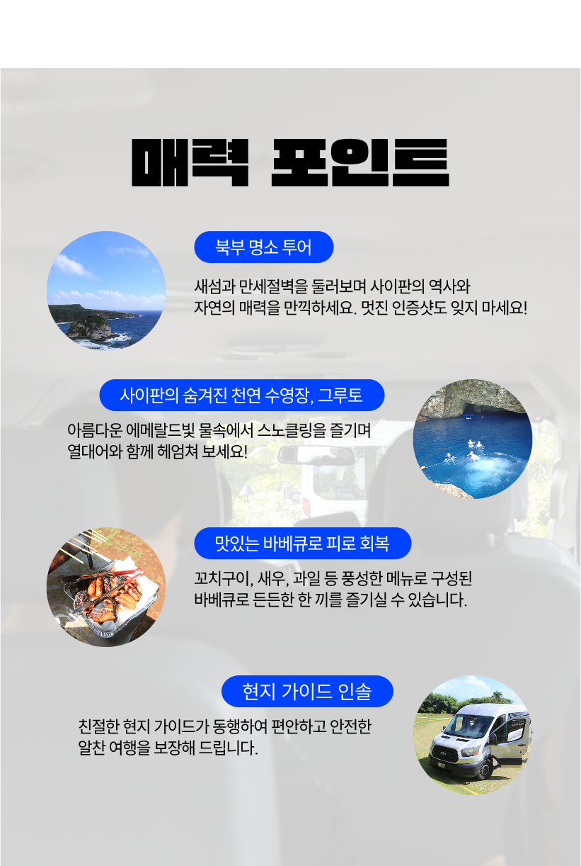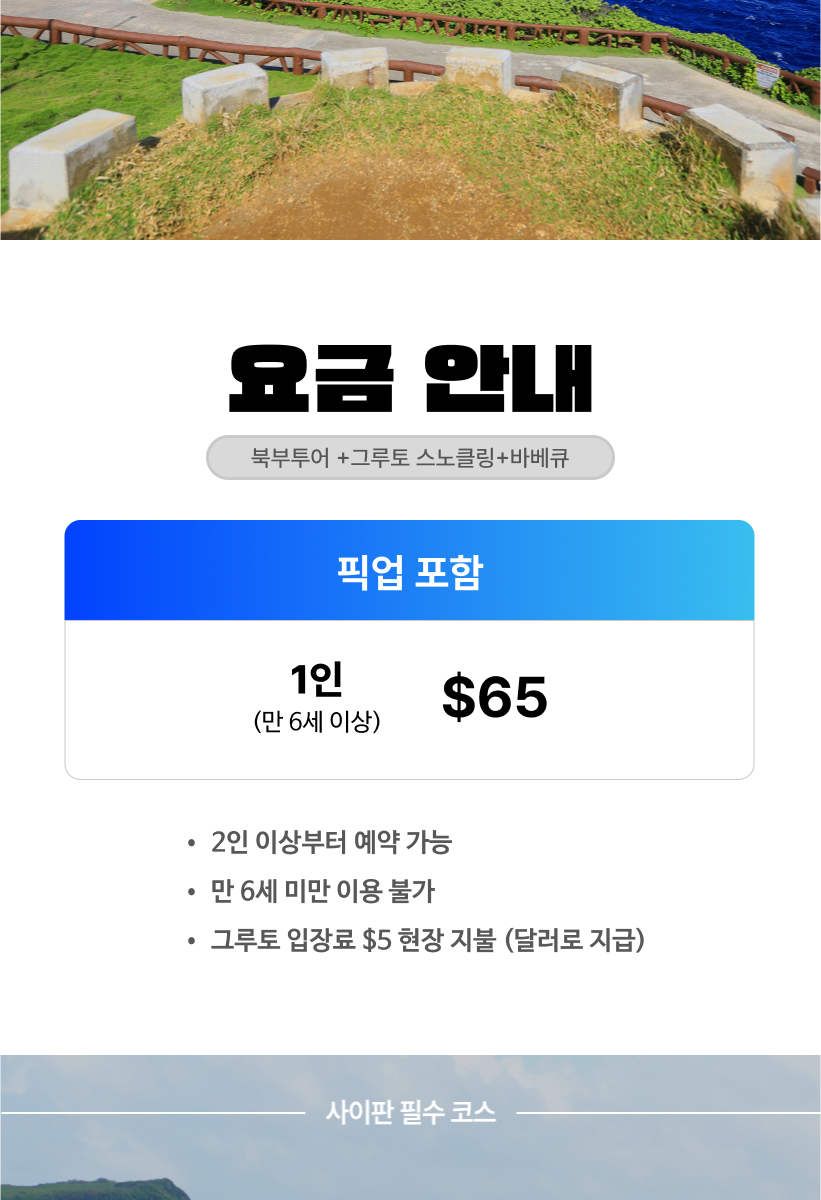 - 고객 부주의로 발생되는 모든 사고에 대해서는 본인이 책임져야 하며, 예약대행사인 사이판플레이와 옵션회사(이하 면책자들)에게 책임을 전가할 수 없습니다.