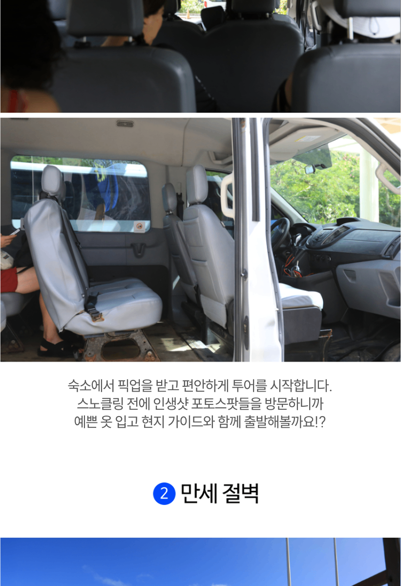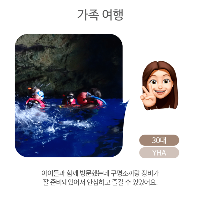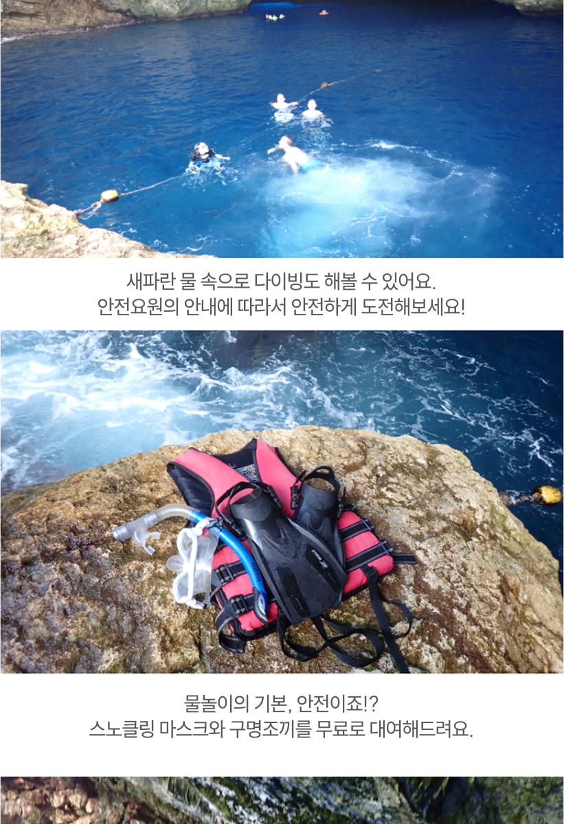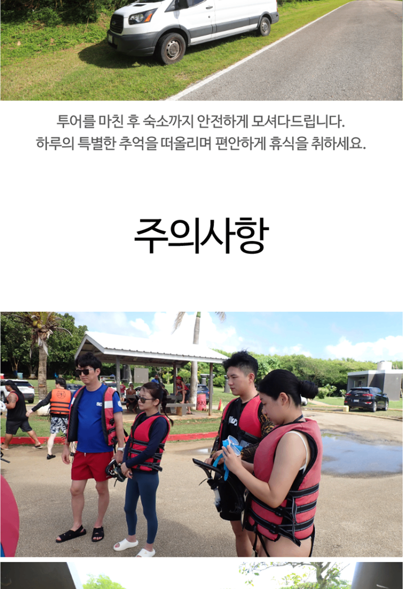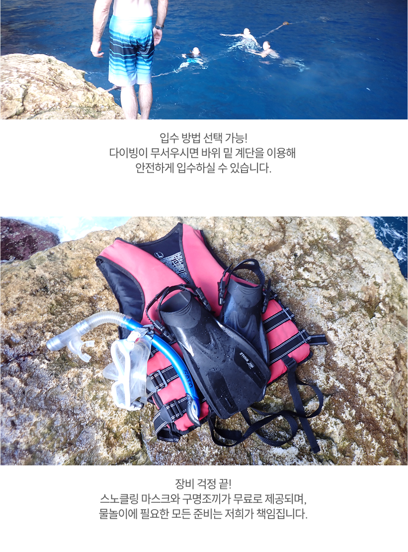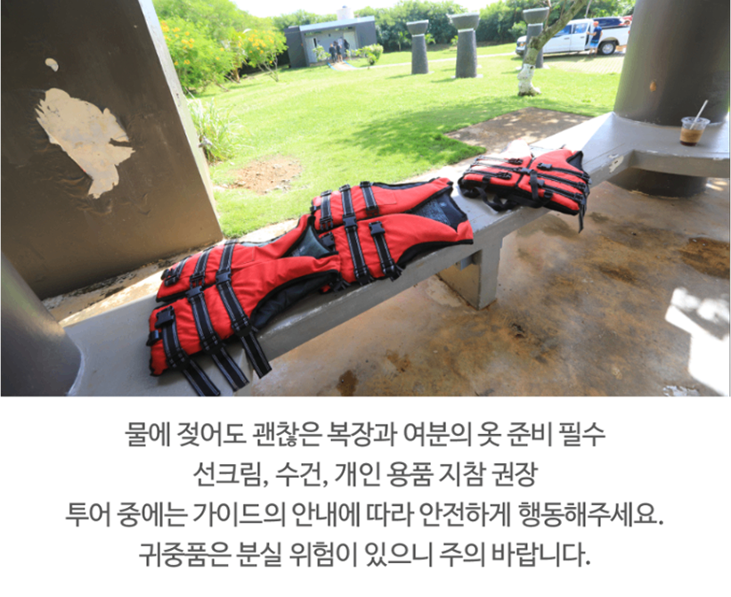- 해당 옵션을 진행하는 안전 장비 (구명조끼)를 반드시 착용하며 안전요원의 보호 없이 바다 뛰어드는 행위 금지 합니다.