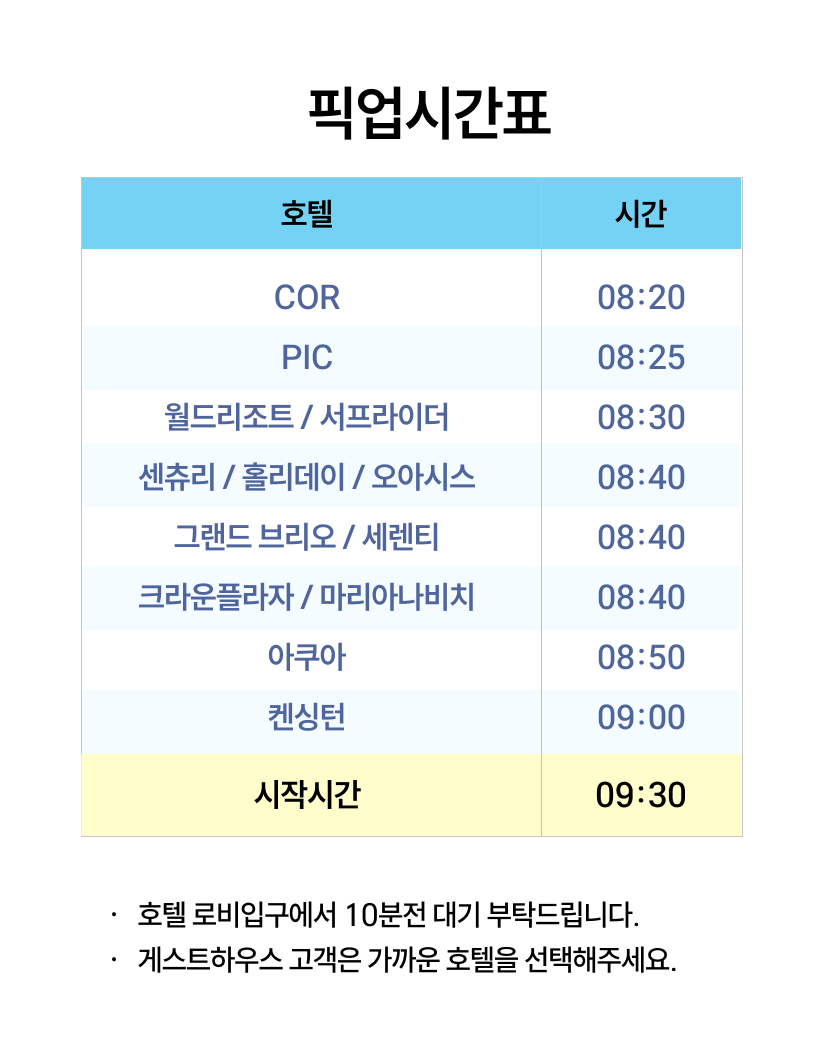 - 변경은 이용일기준 3일전까지 1회만 가능하며, 현지사정에 따라 변경이 불가할 수 있습니다.