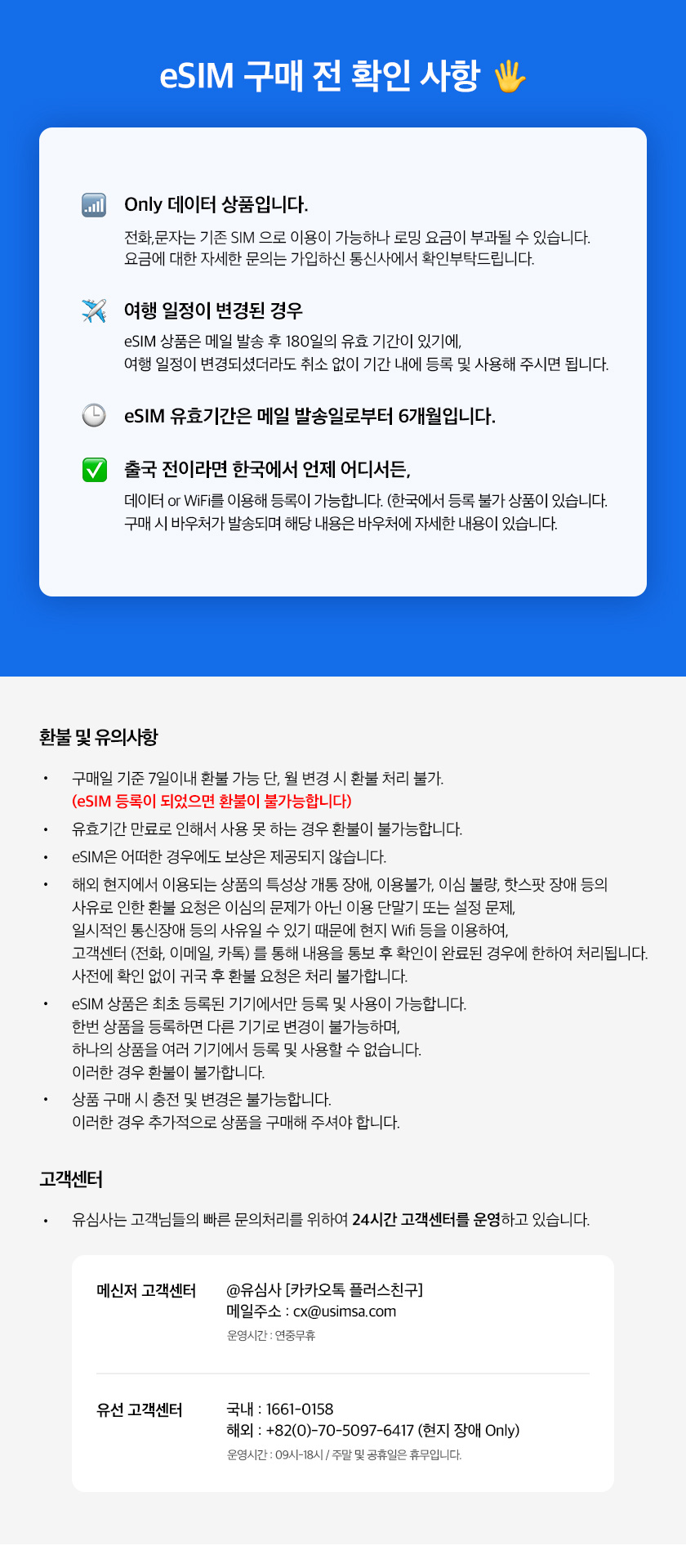 - eSIM은 출발일 기준 최소 3일전(단, 주말 제외) 주문 해주셔야 원활하게 이용 가능합니다.