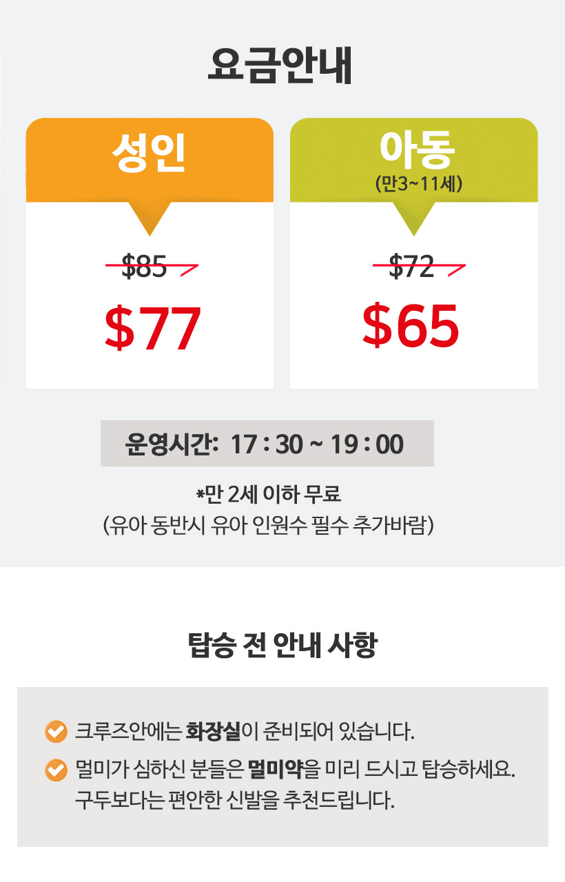 - 날씨 사정에 따라 배가 많이 흔들릴 수가 있으니 멀미가 심하신 분은 미리 멀미약을 준비해주시기바랍니다.