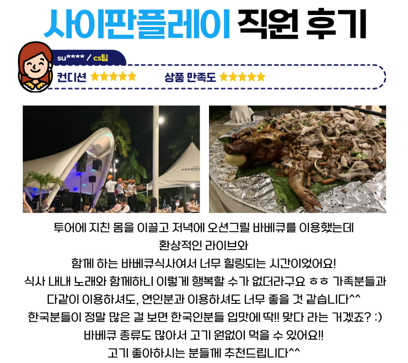 와~ 정성스러운 사진까지ㅜㅜ 후기 너무 감사합니다. 한국인분들에게 인기 짱!!!인 켄싱턴 오션그릴바베큐를 이용해주셔서 감사합니다:)