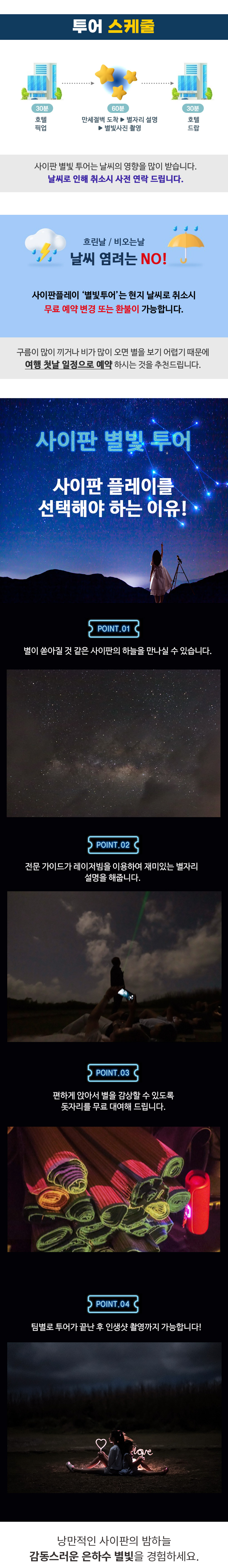 - 별빛 투어는 폭우가 있을 경우 일정 변경을 위해 가급적 여행 첫 날 예약을 추천드립니다.