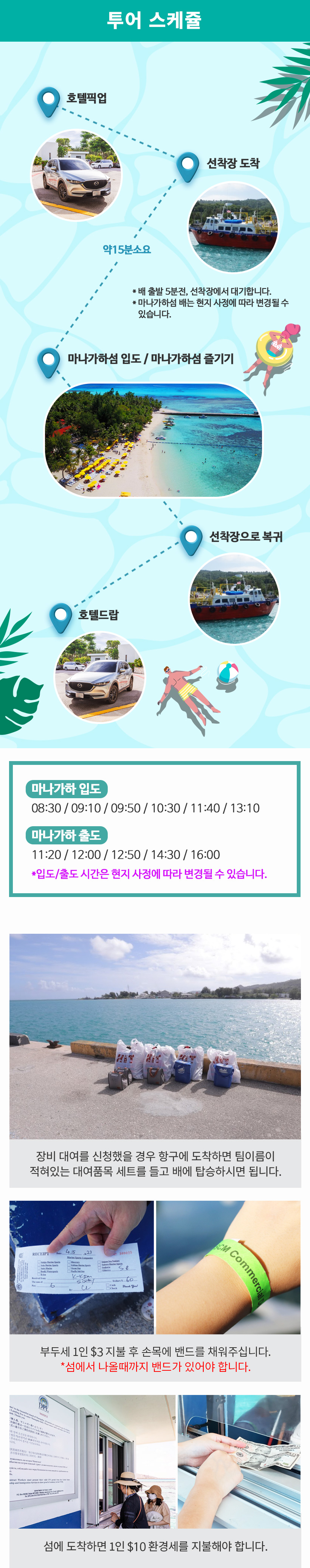 정해진 시간에 친절하게 픽업/드랍오프, 배 승선 안내해주셨습니다. 마나가하섬 출도시간은 16시로 선택했는데 실제는 15:30 이었습니다. (다 동일하겠죠?)