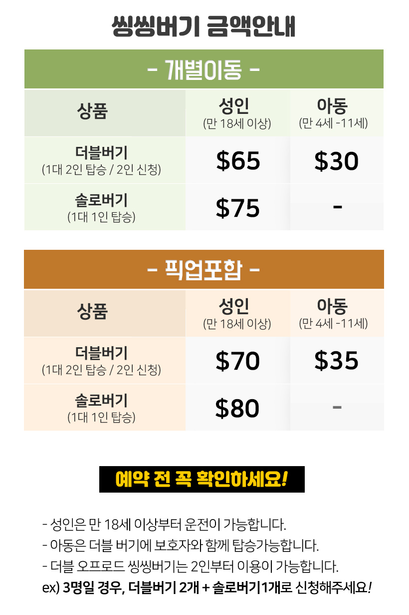 ex)3명일 경우 2명 더블 씽씽버기 +1명 솔로 씽씽 버기로 예약주세요!